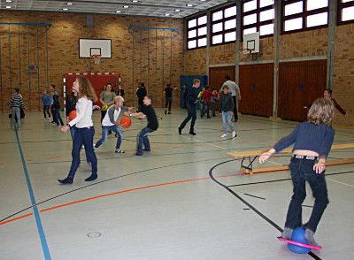 Die Schülerinnen und Schüler der Unterstufe hatten in der Woche der Gesundheit und Nachhaltigkeit täglich jeweils in der ersten Pause die Möglichkeit, sich in der Turnhalle zu bewegen. Den Schülern standen zahlreiche Kleingeräte und fetzige Musik zur Verfügung. Obwohl sie sich lediglich zehn Minuten austoben konnten, äußerten die Schüler den Wunsch gleich am nächsten Tag wiederzukommen.