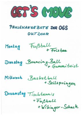 Oft machen Spiele mit Anleitung und Schiedsrichter mehr Spaß und motivieren zur Bewegung an der frischen Luft. Deshalb bieten wir täglich in der Mittags- und OGS-Pause ein sportliches Programm an, für das unsere Mentoren auf dem Hartplatz und dem Pausenhof zur Verfügung stehen: