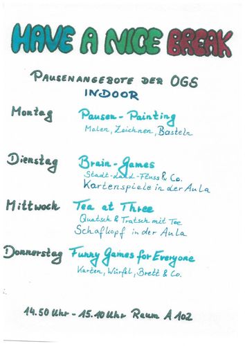 Nach der Pause können Schüler/innen, die alle Arbeiten erledigt haben, zum Spielen, Lesen, Ratschen in den OGS-Raum gehen oder im Atrium Tischtennis spielen.