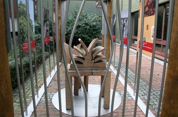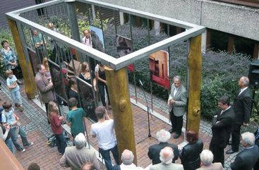 Im B-Trakt des Schulgebäudes befindet sich ein innerer Lichthof mit der Holzskulptur „Ein Raum für Anne Frank“, mit der wir die Erinnerung an unsere Namensgeberin über den Tag hinaus wach halten. Die Idee war, etwas Bleibendes zu schaffen, das auf Anne Frank verweist und zugleich fester Bestandteil des Schulgebäudes wird. Diese Art der Schulhausgestaltung sollte mehr sein als nur ein rein ästhetisches Ornament, nämlich auch ein Zeichen der Erinnerung.