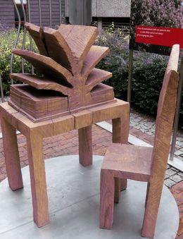 Der „Anne-Frank-Hof“, wie der innere Lichthof genannt wird, wurde als Raum der Ruhe für die Schülerinnen und Schülern der Oberstufe konzipiert, abgeschirmt vom Trubel der Aula und des Pausenhofes. Damit der Hof als Ruheraum genutzt werden kann, bedurfte es jedoch auch der Möglichkeit, sich niederzulassen. Diese Sitzgelegenheiten, die sich hervorragend in den Anne-Frank-Hof einfügen, wurden nun von Wolfgang Fritz unter Mitarbeit der Schülerinnen Eva Bachl, Janina Bitterlich und Jana Jöbstl angefertigt und am 8. Oktober 2010 zusammen mit unserer „Anne-Frank-Kastanie“ eingeweiht. Die Bänke und Stühle, angefertigt aus dem Stamm einer Esche – demselben Holz wie Tisch, Stuhl und Buch im Inneren der Skulptur – sind Unikate.