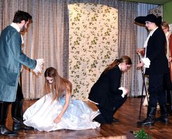 Irgendwie schaffen wir es dann doch zu proben (darunter dreimal am Wochenende!) und tun das unter höchstem Einsatz. An dieser Stelle böte es sich an, auf die diversen Bänderrisse hinzuweisen, die sich Spielleiterin und Schauspieler bei den Proben zugezogen haben. Aber Jammern hilft nichts, das Theater ist uns jedes Opfer wert.