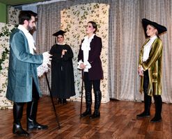 Wie immer kommt mir Shakespeare zu Hilfe. Die Rolle der Katharina aus „Der Widerspenstigen Zähmung“ ist Lisa wie auf den Leib geschrieben. Dann kann Lena die Bianca und Alina eine der großen Freier-Rollen übernehmen. Randolph wird sich schon davon überzeugen lassen, dass die Rolle des Petruchio die Mühe des Textlernens wert ist. Und für Sina haben wir die schöne (und sehr komische) Rolle von Petruchios Diener. Passt. Alles weitere wird sich finden.