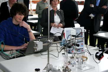 Zum Abschluss des Festaktes führte Herr Landrat Bayerstorfer als Assistent von Fachbetreuer Hildebrand ein physikalisches Experiment durch. Dabei wurden auch die neuen Darstellungsmöglichkeiten mit interaktivem Whiteboard und Kamera (Visualizer) im Einsatz demonstriert. Im Anschluss begaben sich alle auf einen Rundgang durch die 5 neuen Physikfachräume.