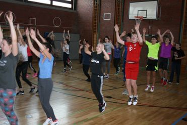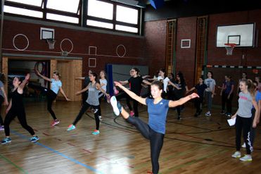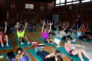 Während der Woche der Gesundheit und Nachhaltigkeit konnte in diesem Jahr wieder der ehemalige Tanzprofi und Tanzlehrer Arthur Faiß für den Sportunterricht der Mädchen aller achten, neunten und zehnten Jahrgangsstufe gewonnen werden. Und weil auch die französischen Austauschschüler aus Obernai gerade zu Besuch waren, wurde die Gruppe kurzerhand vergrößert und insgesamt 40 Mädchen und Jungen in PILATES eingeführt.