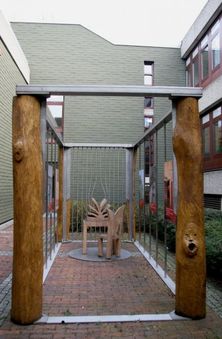 Im B-Trakt des Schulgebäudes befindet sich ein innerer Lichthof mit der Holzskulptur „Ein Raum für Anne Frank“, mit der wir die Erinnerung an unsere Namensgeberin über den Tag hinaus wach halten. Die Idee war, etwas Bleibendes zu schaffen, das auf Anne Frank verweist und zugleich fester Bestandteil des Schulgebäudes wird. Diese Art der Schulhausgestaltung sollte mehr sein als nur ein rein ästhetisches Ornament, nämlich auch ein Zeichen der Erinnerung.