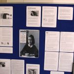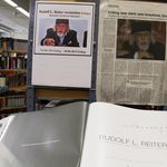 Eine Stellwand neben der Vitrine ergänzt die Ausstellung mit diversen Zeitungsartikeln, die zum 90. Geburtstag erschienen sind.