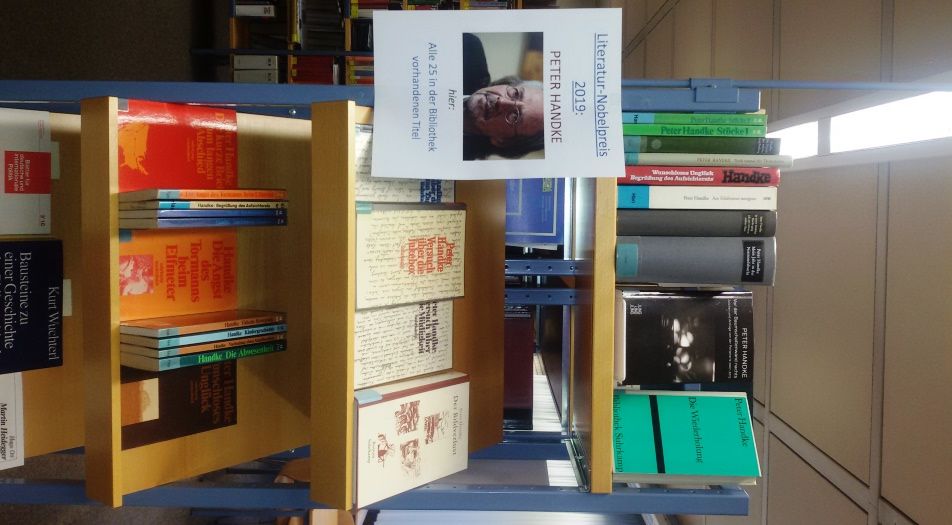 In einer großen Ausstellung können alle Titel, die in unserer Bibliothek von Peter Handke vorhanden sind (immerhin 26 Stück) besichtigt, gelesen und natürlich auch ausgeliehen werden.