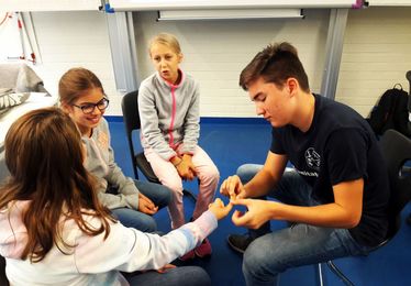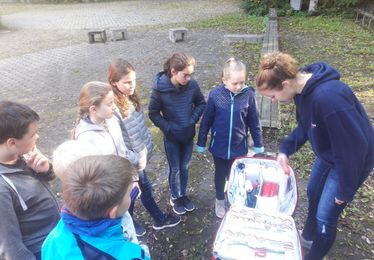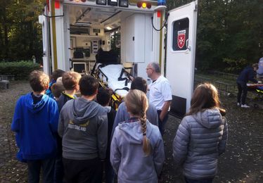 Der Schulsanitätsdienst gestaltete am 15. und 19. Oktober 2018 zwei Tage für die sechsten Klassen im Zeichen der Ersten Hilfe. Die Schulsanitäter bereiteten dazu verschiedene Stationen vor, die alle Schüler/-innen durchliefen: Die Rettungskette, die stabile Seitenlage, Inhalt einer Sanitäter-Tasche und das Anlegen verschiedener Verbände. Zudem durften sie einen Rettungswagen besichtigen, den die Malteser zur Verfügung stellten. Herr Cako, der Einsatzleiter der Malteser Erding, beschrieb den Schülern sehr anschaulich die nötigen Maßnahmen bei Unfällen unterschiedlicher Art. Dafür wollen wir uns ganz herzlich bei den Maltesern Erding bedanken!